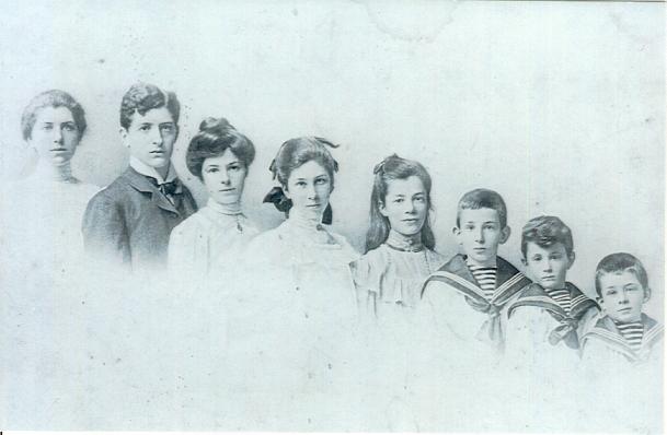 Foto gemaakt in 1904 ter gelegenheid van 25 jarig huwelijk van echtpaar Pel-Salomonson, van links naar rechts: Bine, Lodie, Liesbeth, Zus, Tu, Nico, Santee, Pieter (mijn vader)